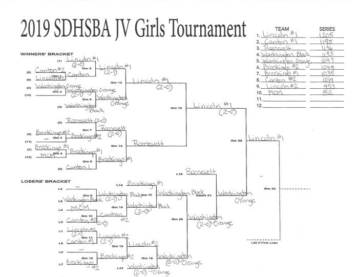 In the girls qualifying round, Sioux Falls Lincoln placed first with a total pinfall of 1,205. On the boys side, Sioux Falls Washington placed first with a total pinfall of 2,196.